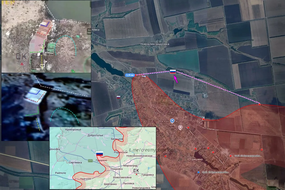 23.03.26 Красноармейск – Гришино. Позиционные боевые действия в районе Красноармейска. ВС РФ заняли новые позиции к северу от Гришино, продвинувшись по направлению к Новоалександровке и увеличив зону контроля более 1 км. Передовая позиция ВС РФ на ставке Квадрат под огнём ВСУ.