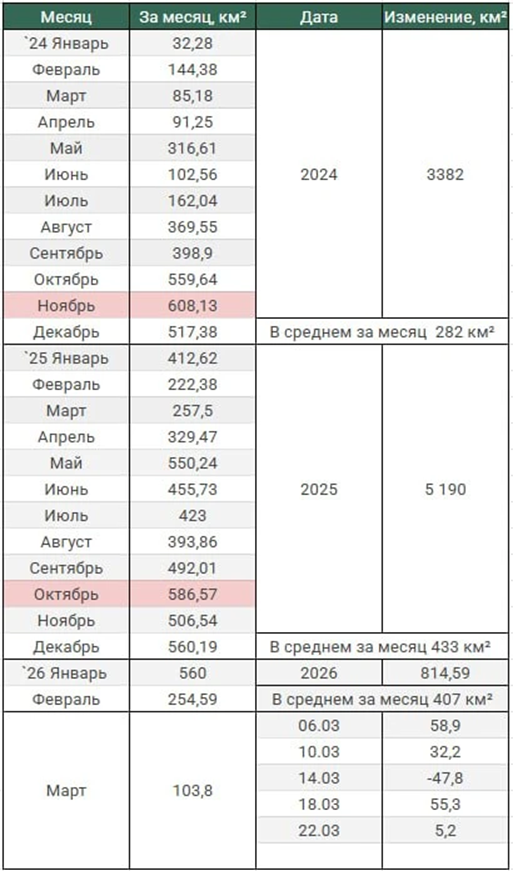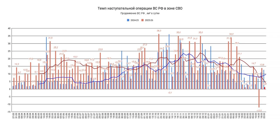 22.03.26 Темп наступления. Среднесуточное продвижение ВС РФ в зоне проведения СВО. Обновление по данным c 18 по 21 марта 2026. Темп продвижения +1,3 км² в сутки за период, общее продвижение +5,2 км².