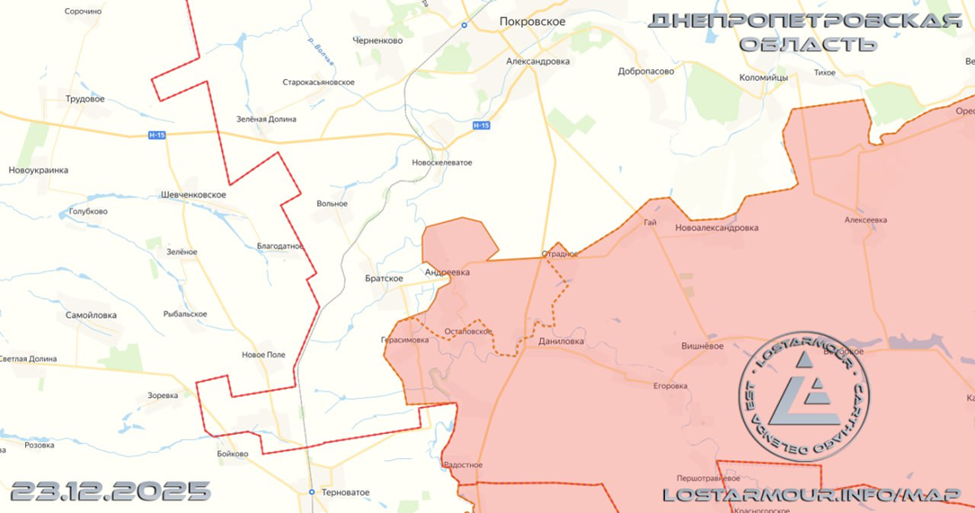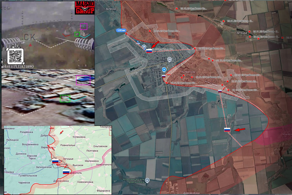 22.12.25 Гуляйполе Активные боевые действия в Гуляйполе. Штурмовые подразделения ВС РФ продвинулись в жилой застройке на севере города увеличив зону контроля до 2 км по фронту и заняли новые позиции на южных подступах к Гуляйполю. Передовые позиции ВС РФ подверглись обстрелу ВСУ