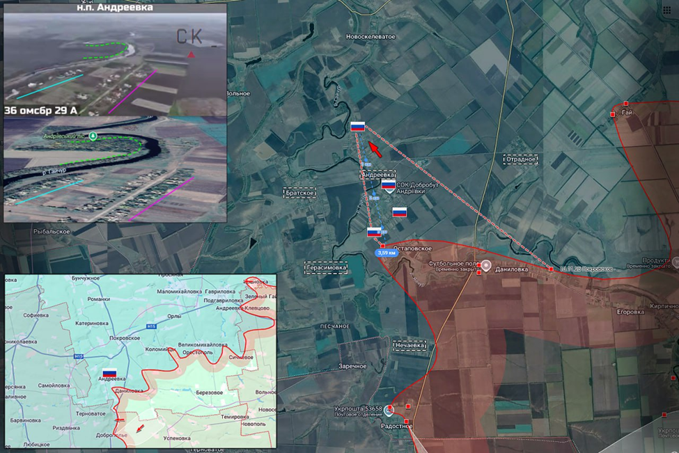 09.12.25 Покровское - Андреевка Последствия боевых действий в Днепропетровской зоне безопасности. После продвижения более 3,5 км вдоль восточного берега реки Гайчур военнослужащие ВС РФ заняли населённый пункт Андреевка. В жилой застройке развёрнуты флаги Российской Федерации. https://t.me/voin_dv/18140