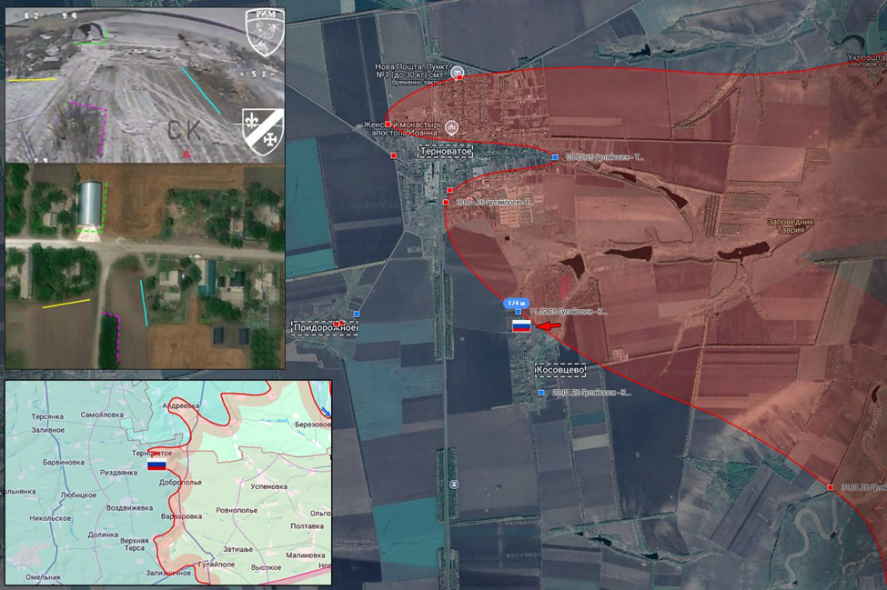 24.02.26 Степногорск - Новояковлевка Позиционные боевые действия в районе Каменского. Передовая позиция ВС РФ в Новояковлевке подверглась обстрелу со стороны ВСУ. ВС РФ увеличили зону контроля до 700 метров и заняли новые позиции в комплексе сельскохозяйственных построек на севере посёлка.