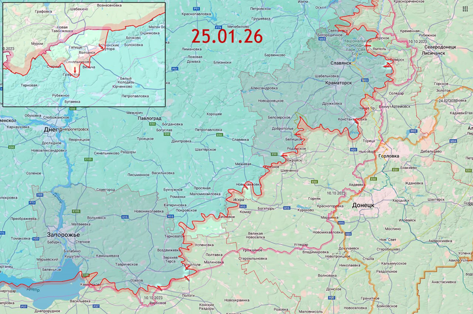 25.01.26 Сводка. Боевые действия с 21 по 24 января 2026 года. В Харьковской зоне безопасности ВС РФ имели продвижение вдоль Северского Донца к югу от Волчанска: заняты новые позиции в Радянском, Жовтневом и атаковали в Червоноармейском-Первом. Продолжается наступательная активность ВС РФ в направлении Волчанских Хуторов. На Краснолиманском направлении отмечаются боевые действия с участием ВС РФ на южной окраине города в микрорайоне Лесной. Около Северска ВС РФ увеличивают зону контроля в жилой застройке Резниковки и на северных подступах к населенному пункту. В Константиновке ВС РФ продвинулись к центру города на 1 км и заняли новые позиции около Железнодорожного вокзала. В районе Красноармейска ВС РФ атаковали западнее Дорожного и ведут боевые действия в восточной части Гришино. В Днепропетровской зоне безопасности имеется продвижение ВС РФ по западному берегу реки Солёная в Новопавловке. Около Гуляйполя ВС РФ контролируют южные подступы к городу и заняли новые позиции вдоль железной дороги Пологи-Зализничное. На Ореховском направлении штурмовые подразделения ВС РФ достигли западных окраин жилой застройки в Белогорье. Карта https://goo.gl/maps/4eum5C9giNDebgXf7