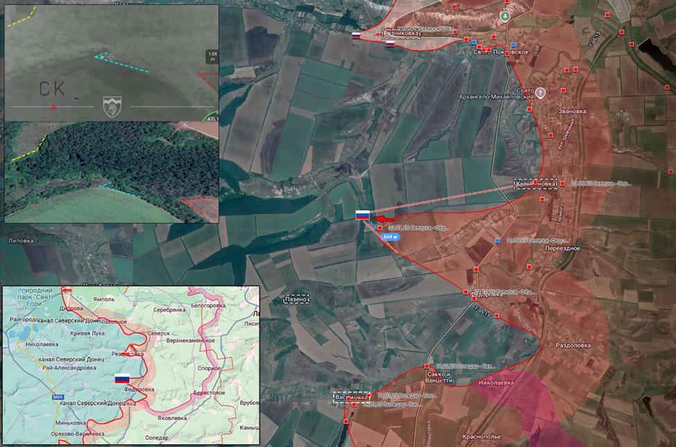 25.01.26 Северск - Пазено Позиционные боевые действия в районе Северска. Передовая позиция ВС РФ попала под обстрел ВСУ . ВС РФ продвинулись на рубеже Резниковка - Пазено до 700 метров и заняли новые позиции.