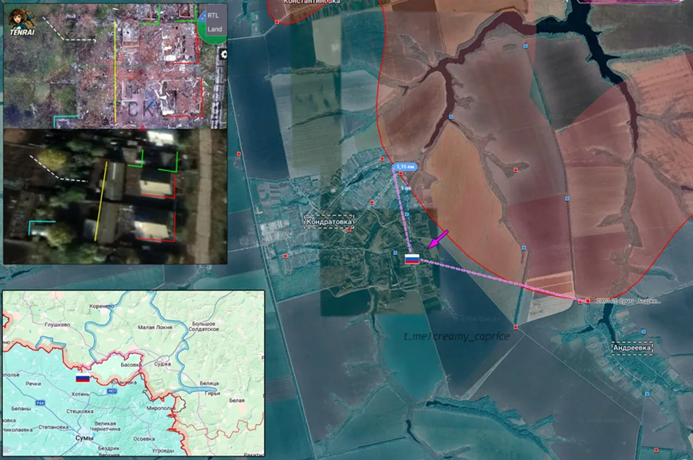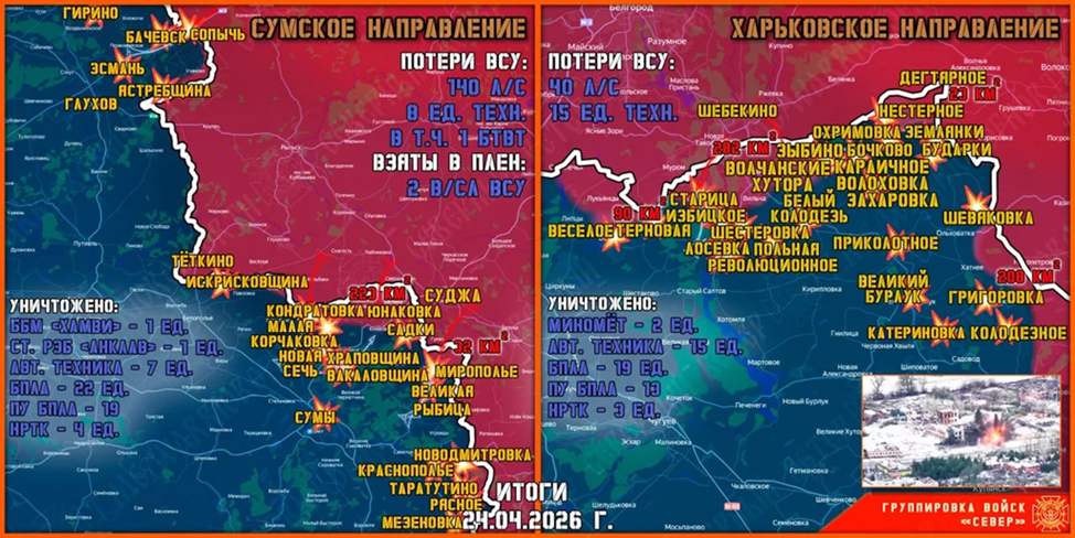 24,04.26 Сумы - Кондратовка Позиционные боевые действия в Сумской зоне безопасности. ВС РФ продвинулись в Кондратовке около 1 км и вернули утраченные ранее позиции в восточной части посёлка. Передовая позиция ВС РФ подверглась обстрелу ВСУ.