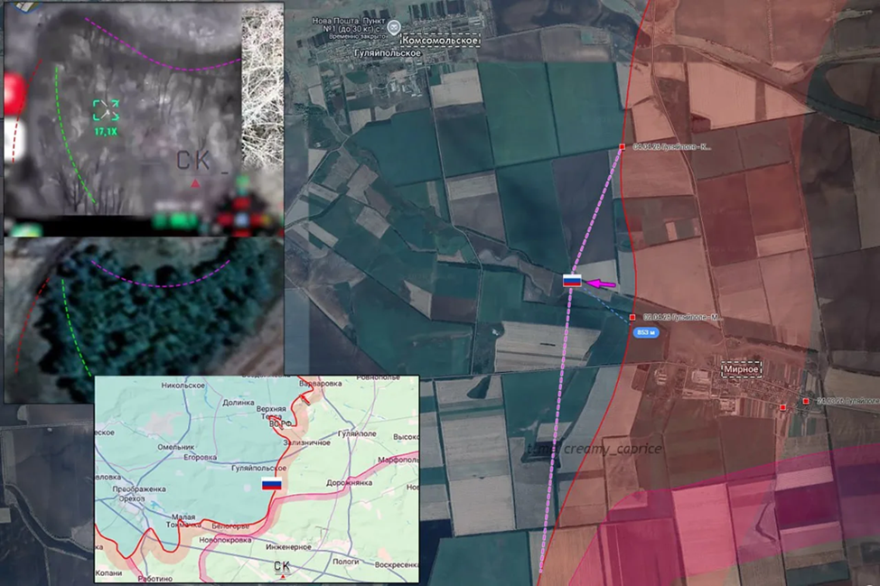 25.04.26 Гуляйполе – Мирное. Позиционные боевые действия в районе Гуляйполя. Передовая позиция ВС РФ в окрестностях Мирного обстреляна ВСУ. ВС РФ увеличили зону контроля на запад от населённого пункта более 800 метров.