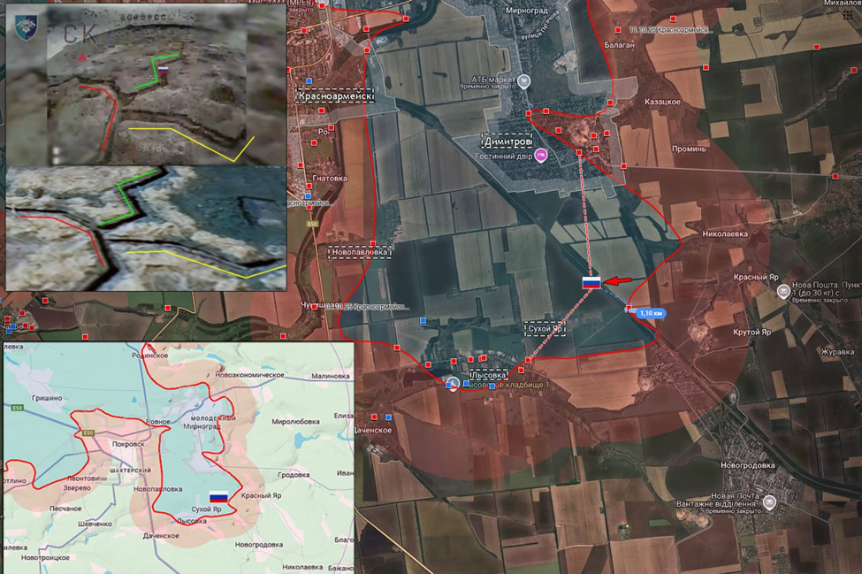 26.11.25 Димитров - Сухой Яр Активные боевые действия в районе Красноармейска. Штурмовики ВС РФ занимают позиции в опорном пункте на рубеже Димитров - Сухой Яр. Продвижение ВС РФ 1 км к югу от Димитрова. Обстрел штурмовой группы со стороны ВСУ.