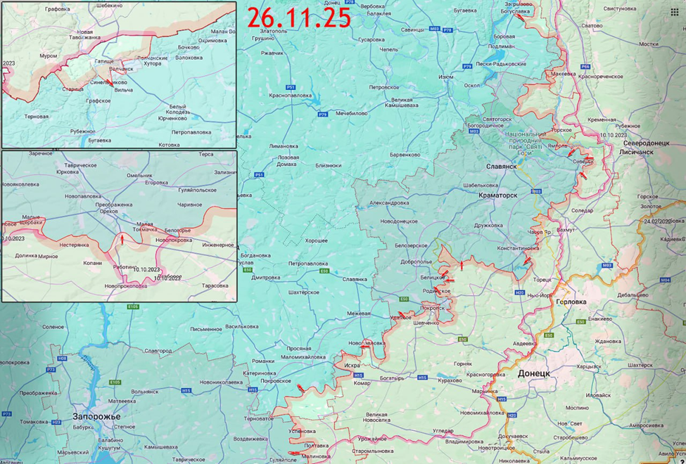 26.11.25 Сводка. Боевые действия с 22 по 25 ноября 2025 года. В Харьковской зоне безопасности штурмовики ВС РФ продвинулись в Синельниково и вышли в южную часть населённого пункта. В районе Боровой пехотное подразделение ВС РФ атаковало в направлении реки Оскол и заняло новые позиции в Богуславке. Около Северска ВС РФ заняли населённый пункт Платоновка, закрепились на новых позициях в северной части Северска и увеличили зону контроля в Звановке, подняв флаги Российской Федерации в северной и западной частях населённого пункта. На Горловском направлении ВС РФ вышли на новые позиции по реке Кривой Торец около Иванополья. Севернее Красноармейска под контроль ВС РФ взяты населённый пункт Октябрьское, Никаноровка, северная часть Родинского, произведена высадка десанта на рубеже Суворово - Никаноровка. В Днепропетровской зоне безопасности, район Межевой, ВС РФ увеличили контроль южной части Новопавловки. Около Покровского подняты флаги Российской Федерации в Тихом. На северном охвате Гуляйполя ВС РФ достигли новых позиций в Затишье, населённый пункт под уверенным контролем сил Российской Федерации. Карта https://goo.gl/maps/4eum5C9giNDebgXf7