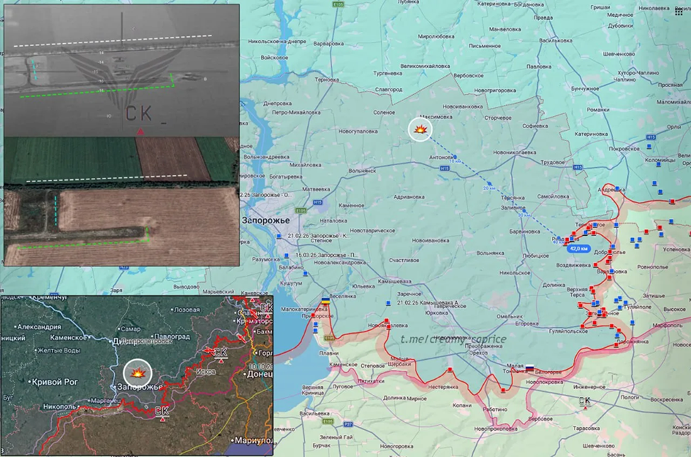 27.03.26 Вольнянск - Васильковское Уничтожение средств ПВО ВСУ. Заявлено как обстрел со стороны ВС РФ барражирующими боеприпасами элементов зенитно-ракетного комплекса "Patriot" на полевом аэродроме посёлка Васильковское. Удаление от зоны активных боевых действий около 42 км.
