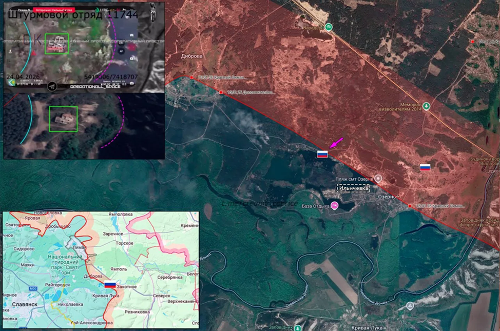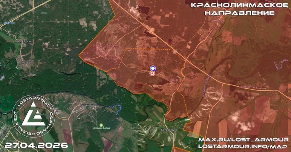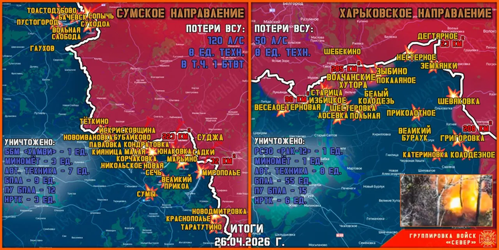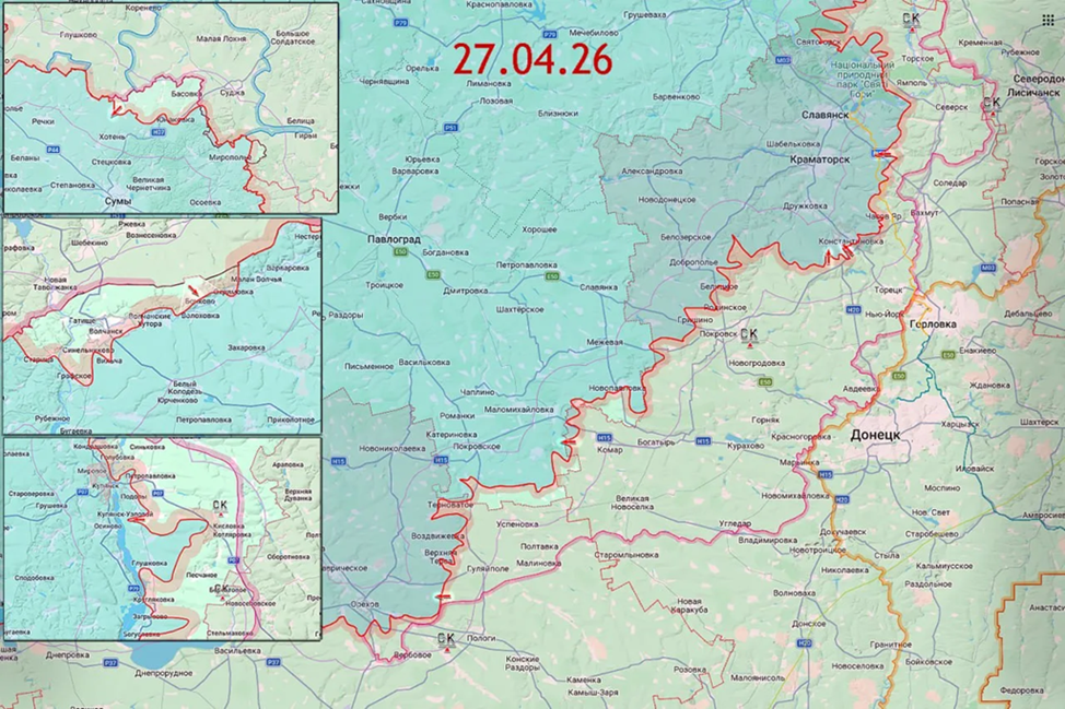 27.04.26 Сводка. Боевые действия с 23 по 26 апреля 2026 года. В Сумской зоне безопасности ВС РФ заняли новые позиции в восточной части посёлка Кондратовка. В Харьковской зоне безопасности ВС РФ вышли на окраины Бочково и ведутся боевые действия за контроль жилой застройки. На Купянском направлении ВС РФ завязали боевые действия на восточных окраинах города Купянск-Узловой. Около Артёмовска ВС РФ продвинулись вдоль трассы Е40 и вышли на канал Северский Донец-Донбасс около Малиновки. В Константиновке ВС РФ продвинулись на юге города в направлении микрорайона Солнечный. Западнее города ВС РФ заняли новые позиции в восточной части Долгой Балки. В районе Великой Новосёлки ВС РФ вышли к реке Волчья севернее Александрограда. Около Гуляйполя ВС РФ продвинулись на запад от Мирного, отмечаются боевые действия с присутствием ВС РФ в Новосёловке. Карта https://goo.gl/maps/4eum5C9giNDebgXf7