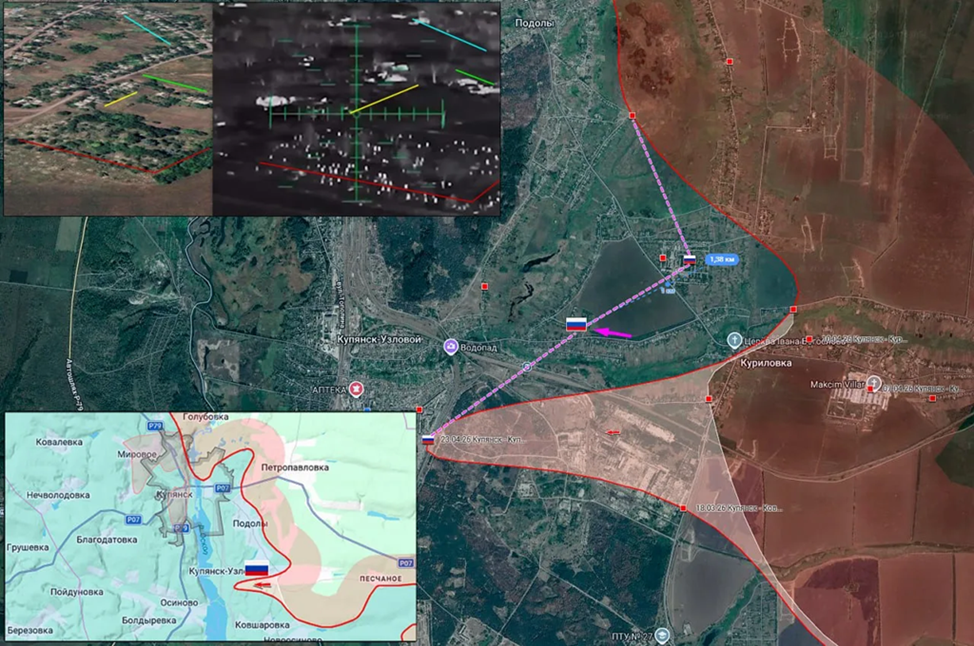 27.04.26 Купянск - Куриловка Позиционные боевые действия в районе Купянска. Передовая позиция ВС РФ в Куриловке попала под обстрел ВСУ. ВС РФ заняли новые позиции в центральной части населённого пункта и увеличили зону контроля до 1,5 км.