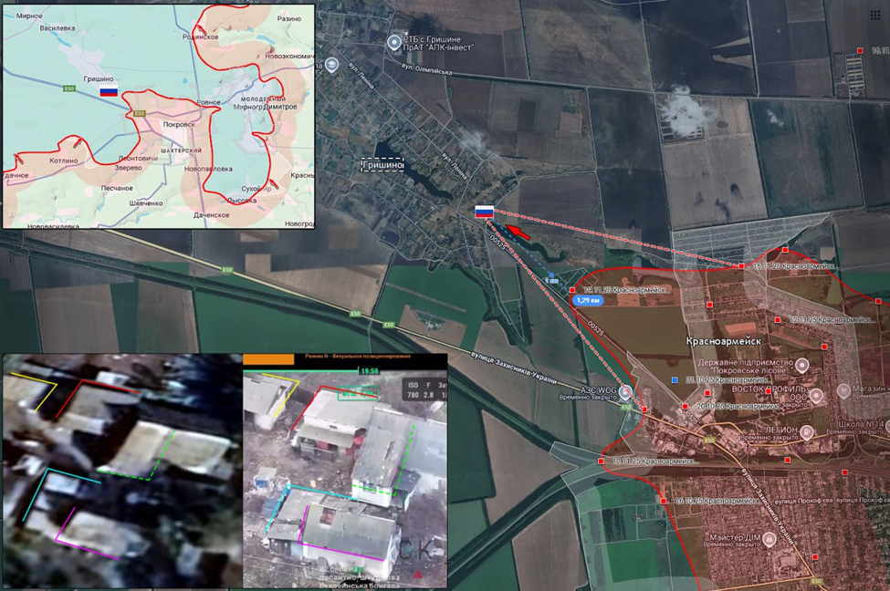 27.11.25 Красноармейск - Гришино Активные боевые действия в районе Красноармейска. Штурмовки ВС РФ занимают новые позиции в Гришино. Передовые позиции в жилой застройке под огнём противника. Продвижение ВС РФ более 1 км на запад, выход на окраины Гришино.