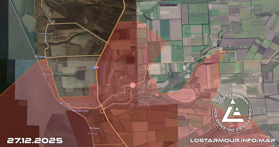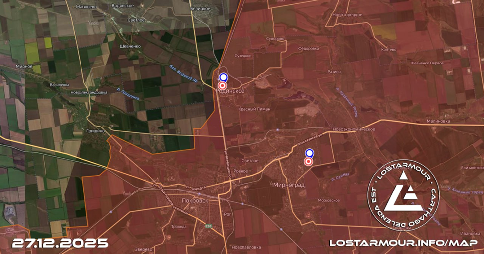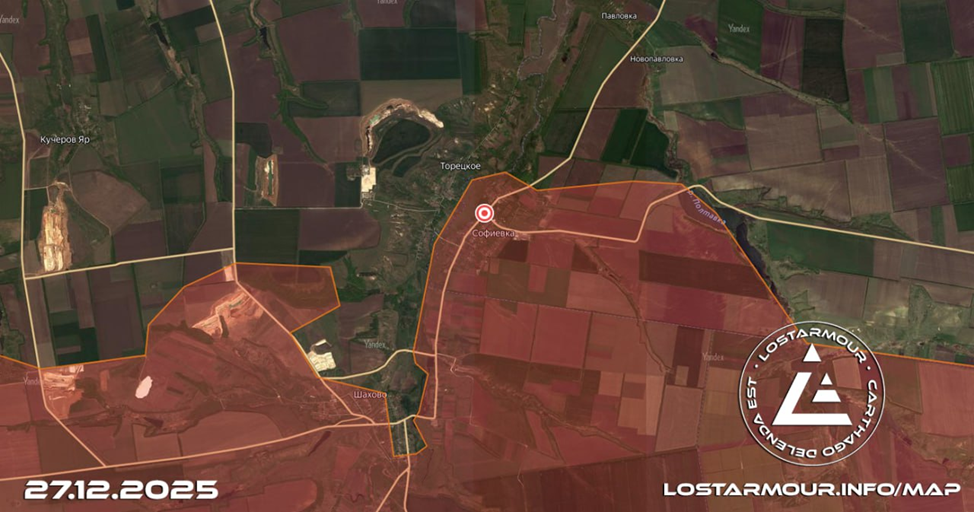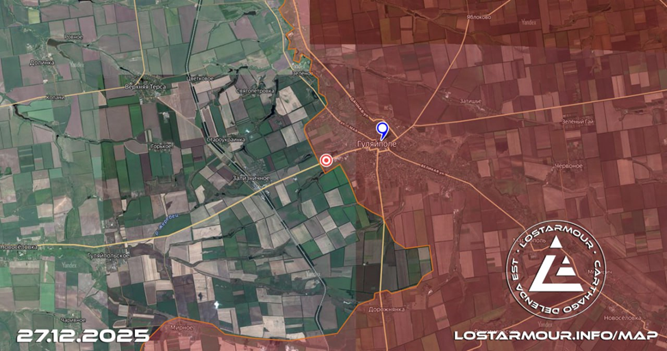 27.12.25 Гуляйполе. Штурм Гуляйполя. ВС РФ продвинулись в северной части жилой застройки города и взяли под контроль новые позиции в частном секторе. На занятых позиция развёрнут флаг Российской Федерации. https://t.me/voin_dv/18185 и https://t.me/voin_dv/18187