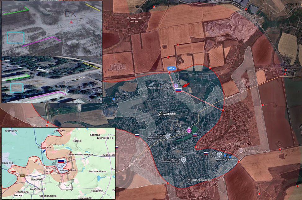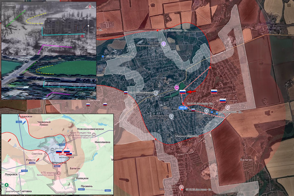 27.12.25 Димитров – Центр. Последствия боевых действий в районе Красноармейска. Военнослужащий ВС РФ поднимает флаг Российской Федерации около одного из домов в центральной части Димитрова. Продвижение ВС РФ более 400 метров в жилой застройке города. https://t.me/mod_russia/59834