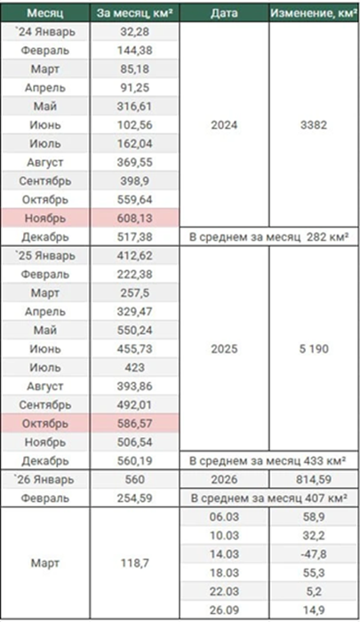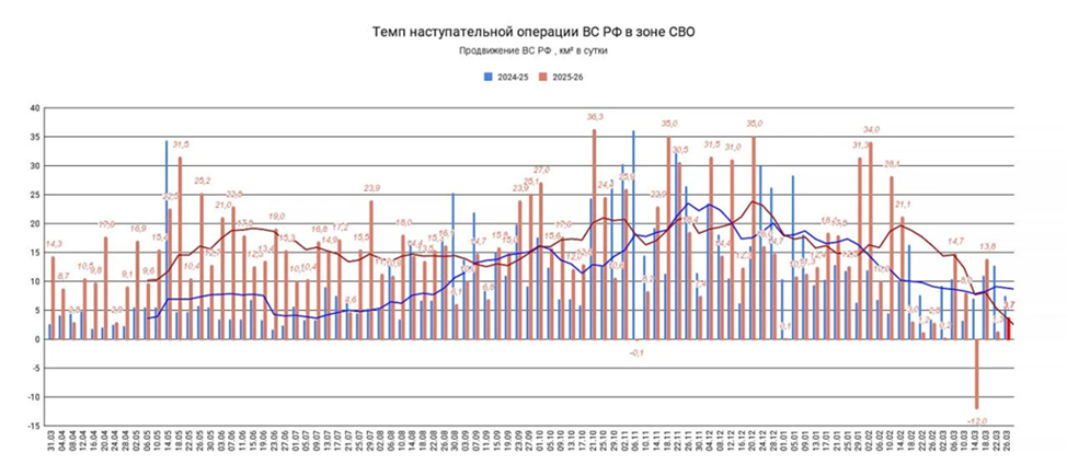 26.03.26 Темп наступления Среднесуточное продвижение ВС РФ в зоне проведения СВО. Обновление по данным c 22 по 25 марта 2026. Темп продвижения +3,7 км² в сутки за период, общее продвижение +14,9 км². Карта www.creamy-caprice.net
