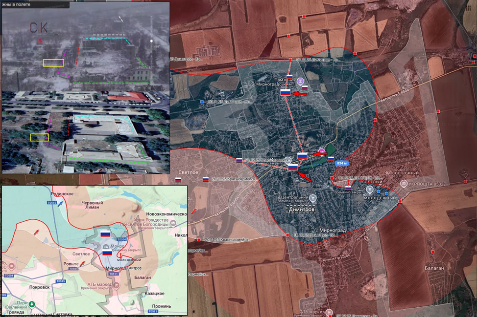 27.12.25 Димитров - Центр - Посёлок Новатор. Последствия боевых действий в районе Красноармейска. Военнослужащие ВС РФ поднимают флаги Российской Федерации в застройке Димитрова, подтверждая уверенный контроль центральной части города, на шахте "Центральная" и в посёлке Новатор. Увеличение зоны контроля ВС РФ в Димитрове 800 метров. https://t.me/SolovievLive/350371