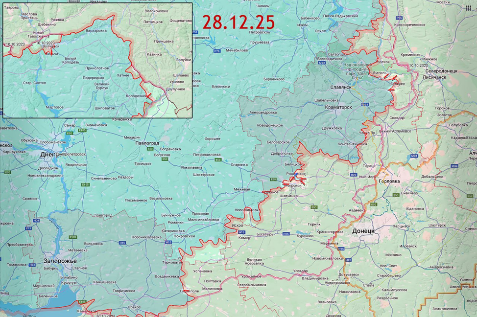 28.12.25 Сводка. Боевые действия с 24 по 27 декабря 2025 года. В Харьковской зоне безопасности штурмовики ВС РФ продвинулись около Волчанска и заняли ряд новых позиций в населённом пункте Вильча. В Великобурлуцком районе проводились штурмовые действия мотострелковыми группами по рубежу Каменка - Двуречанское. В Купянске ВС РФ демонстрируют стабильный контроль промзоны зоны в восточной части города и на западном берегу в северных кварталах жилой застройки. Продолжаются боевые действия в районе Центральной площади и Городской больницы. По архивному видео установлен заход штурмовых групп ВС РФ центральную часть Красного Лимана. На Северском направлении ВС РФ начали боевые действия за контроль жилой застройки в Закотном, в окрестностях Северска взяты позиции у железнодорожного моста через Бахмутовку. Имеется продвижение в Кирово с выходом передовых подразделений в западную часть посёлка. В Красноармейской агломерации на значительной части территории Димитрова подняты флаги Российской Федерации. ВС РФ продвинулись севернее и западнее окраин Красноармейска. ВСУ удалось занять южную часть Родинского. В Запорожской области штурмовые подразделения продвинулись в Гуляйполе и вышли на западные окраины города, по территории подняты многочисленные флаги Российской Федерации.