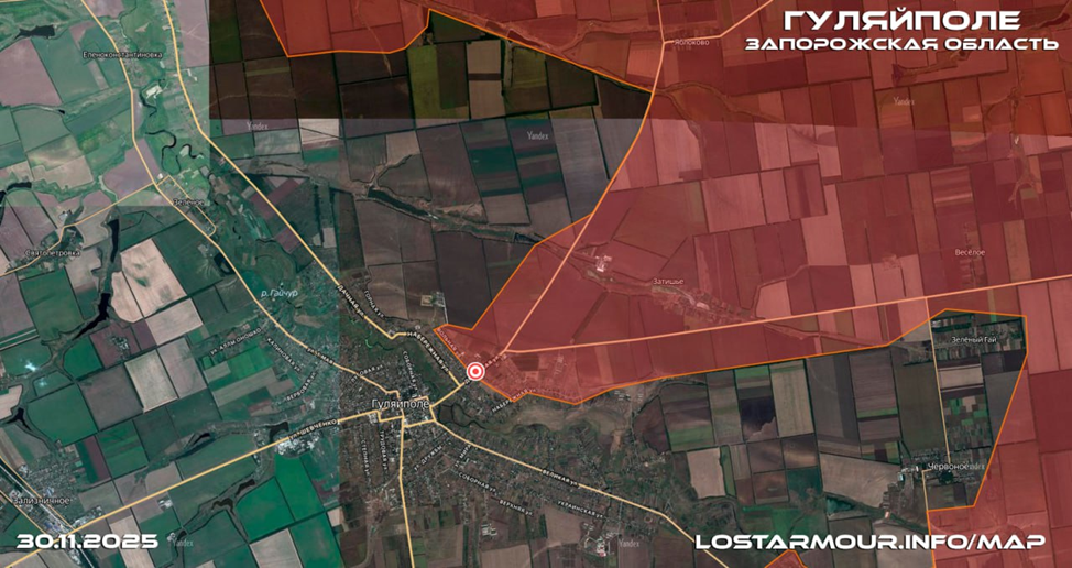 29.11.25 Гуляйполе- Варваровка. Активные боевые действия в районе Гуляйполя. ВС РФ расширяют зону контроля на северном охвате Гуляйполя. Штурмовые подразделения продвинулись более 5 км в направлении Варваровки. Военнослужащие ВС РФ под обстрелом ВСУ.