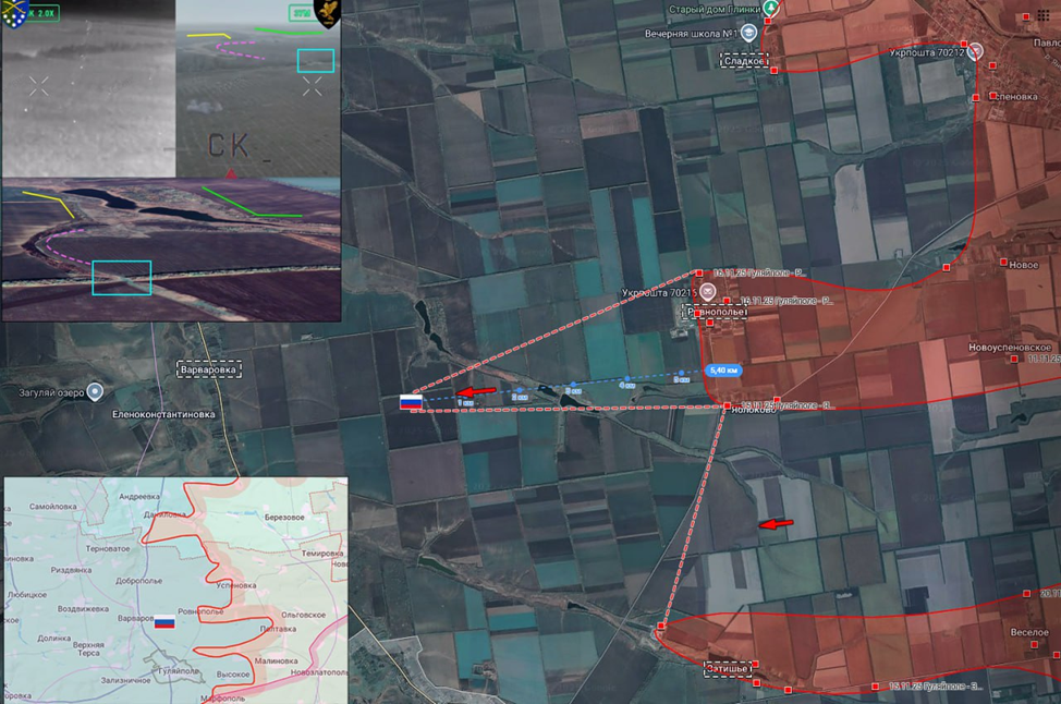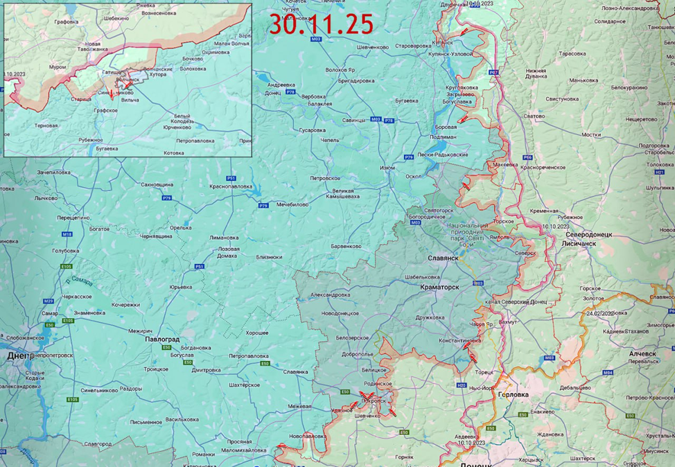 30.11.25 Сводка. Боевые действия с 26 по 29 ноября 2025 года. В Харьковской зоне безопасности ВС РФ атакуют позиции ВСУ в центральной части Лимана южнее Волчанска. В Волчанске заняты позиции на трассе к Харькову около заправочной станции. В районе Купянска ВС РФ предприняли механизированный штурм с выходом к северным окраинам Петропавловки. Около Боровой штурмовиками ВС РФ занят опорный пункт на ближних подступах к посёлку со стороны Боровской Андреевки. По архивным данным уточнена линия боевого соприкосновения на рубеже Карповка - Среднее в районе Красного Лимана. В Константиновке ВС РФ ведутся боевые действия за новые позиции на южной окраине города около железнодорожного депо. Взята под контроль центральная часть Плещеевки. В Красноармейском мешке ВС РФ продвинулись к югу от Димитрова. Западнее Красноармейска ВС РФ начали боевые действия за контроль позиций в Гришино и в районе АЗС на трассе Е-50. ВС РФ усилили своё присутствие в горловине Красноармейского мешка, а так же продвинулись к северу от Котлино. В Днепропетровской зоне безопасности в районе Межевой под контроль ВС РФ перешли позиций в западной части Ивановки.